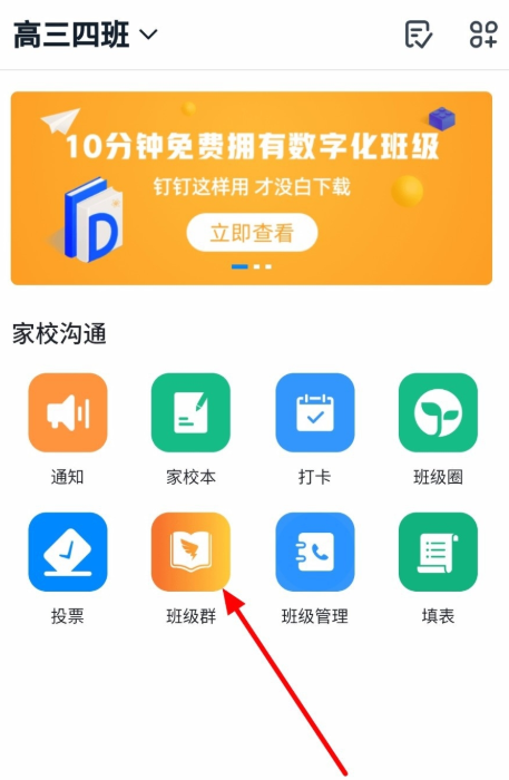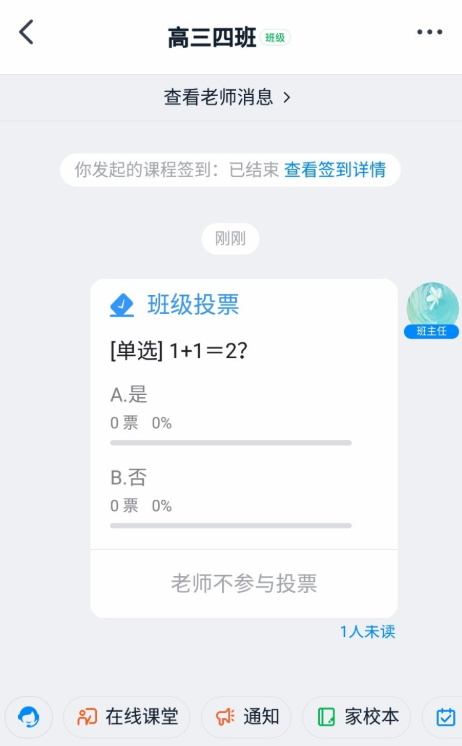 自动返回工作界面,如图,点击【班级群】,打开群聊,你可以看到刚刚发起的投票。