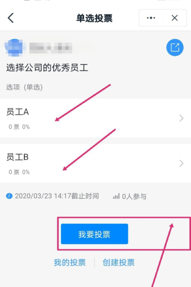 成功创建投票,如图,你可以点击右上角分享按钮,将投票发送到钉钉群聊。