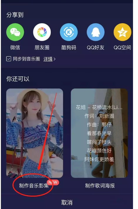 进入新的界面,如图,这里有各种选项,你可以将歌曲分享至微信、QQ、朋友圈等,或者点击【制作音乐影集】,