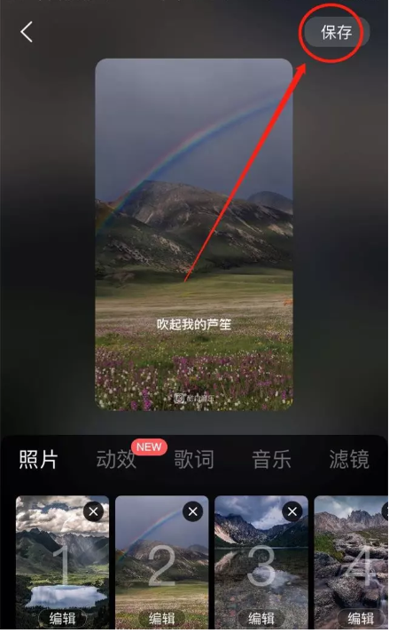 照片添加完成,你可以点击【编辑】,进行相关设置,还可以添加动效、滤镜等,最后点击【保存】,即可制作酷狗音乐影集,