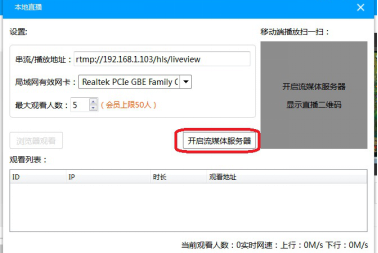 2、弹出本地直播窗口,串流/播放地址和局域网有效网卡自动分配,最大观看人数默认【5】人,若开通会员则最大上限为【30】人。点击【开启流媒体服务器】,程序会自动为你部署一个做局域网直播与推流的ngnix服务器。