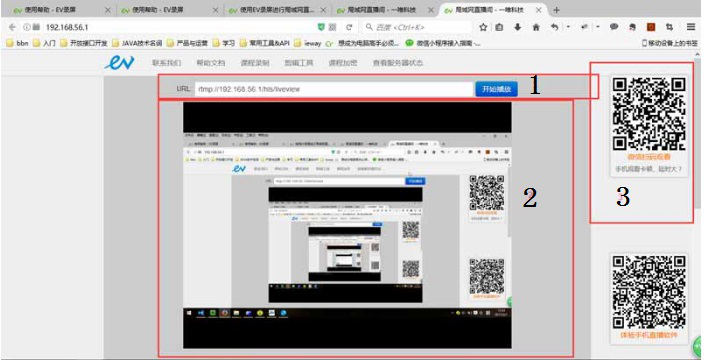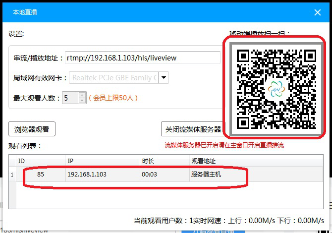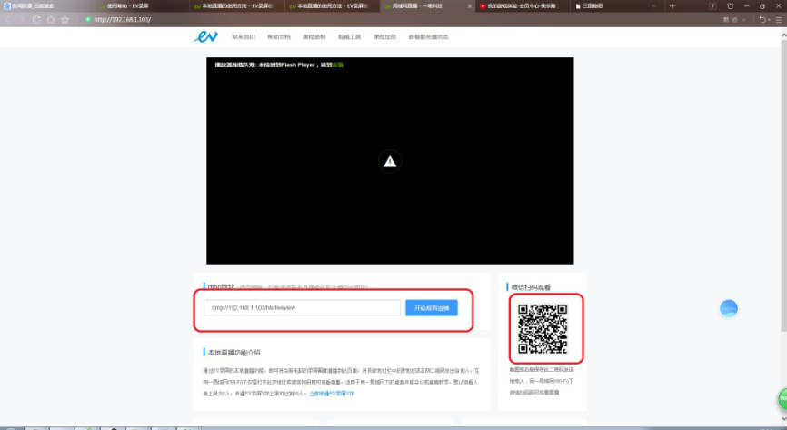 7、在浏览器内,播放器窗口开始播放直播画面,此时本地直播开启成功。手机端可直接扫描右侧二维码,电脑端复制浏览器地址链接即可分享直播。