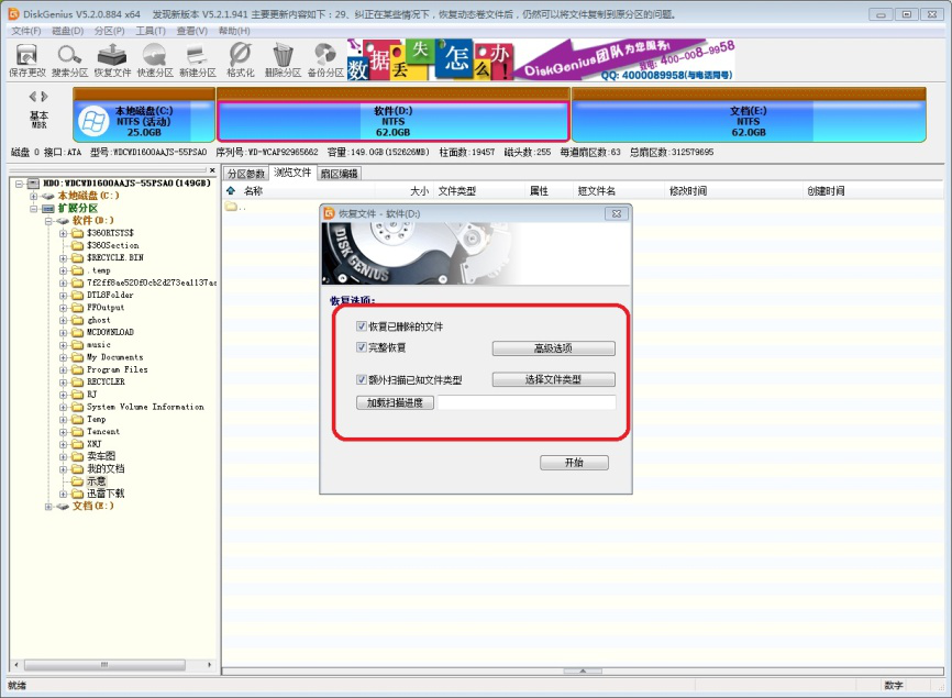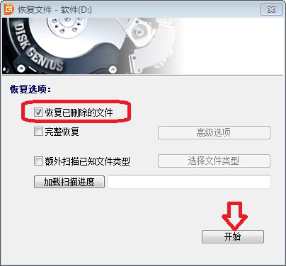 4、只勾选“恢复已删除的文件”,然后点击【开始】。注意:先不要勾选“额外扫描已知文件类型”。