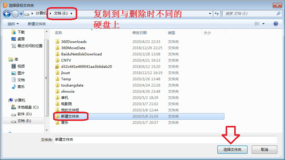 12、弹出“选择目标文件夹”窗口,注意选择与原删除文件所在不同的硬盘文件夹,比如原删除文件在D盘,这里选择E盘。然后点击【选择文件夹】。