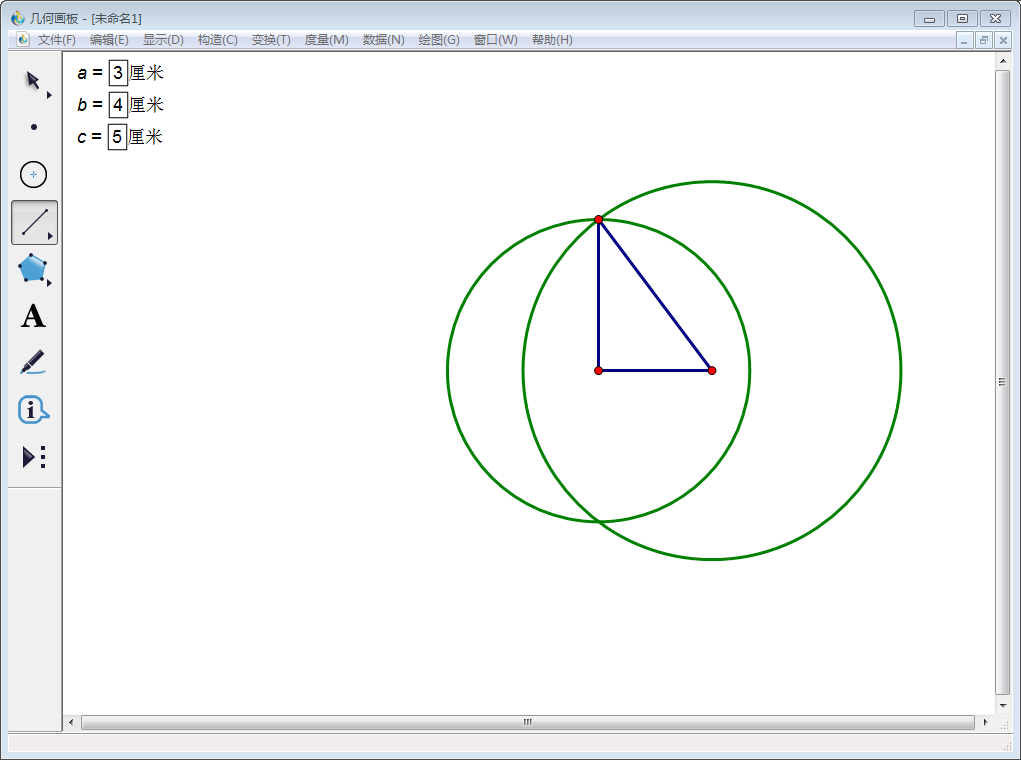 大家都知道,在CAD中可以绘制已知长度的图形,同样在几何画板中也可以实现。为了方便演示,我们假设已知图形为三角形,三条边长度分别为3厘米、4厘米、5厘米,绘制步骤如下:
