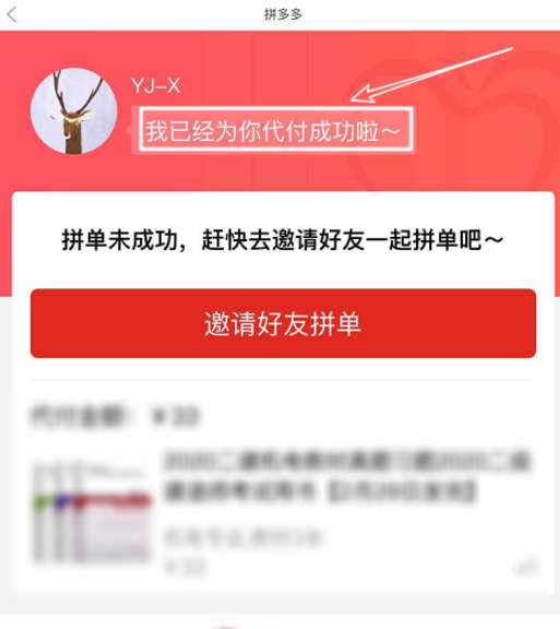 对方收到信息并成功付款,你可以看到订单页面显示“我已经为你代付成功了”,现在只需要耐心等待商家发货。