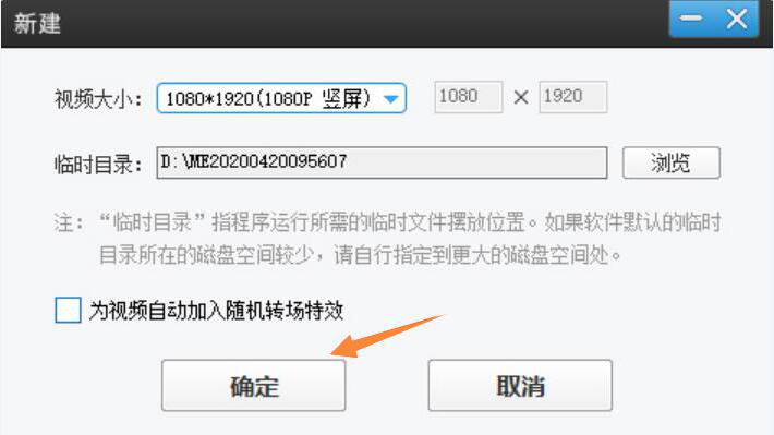 2、此时,爱剪辑便会弹出“新建”的窗口。因为是要把横屏视频剪辑成竖屏,所以,用户在此窗口中,视频大小要设置为竖屏的比例,例如“1080*1920(1080P 竖屏)”,设置临时目录,点击“确定”按钮。