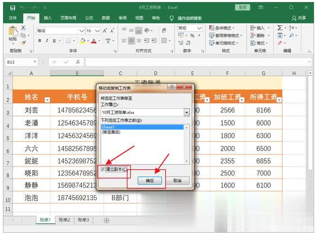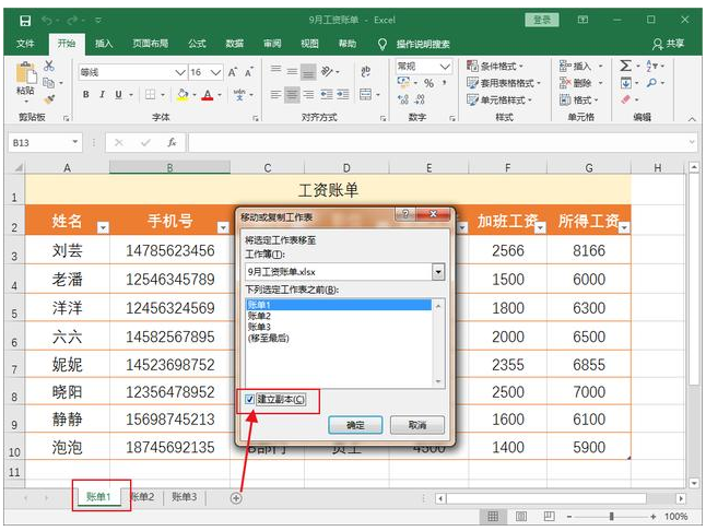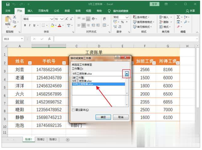 1、打开名为“9月工资账单”的Excel工作簿,简化鼠标移到到表名,右键选择【移动或复制】,弹出对话框,如图,点击下拉【工作簿】,选择需要粘贴的新工作表;注意,新的工作簿必须为打开状态,否则找不到,