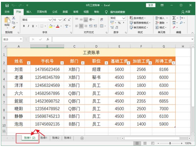 3、此时你会看到一个新的表格【账单1(2)】,里面的数据以及格式与账单1完全一样,你只需要修改工作表的名字,删除原有数据,即可录入新数据。