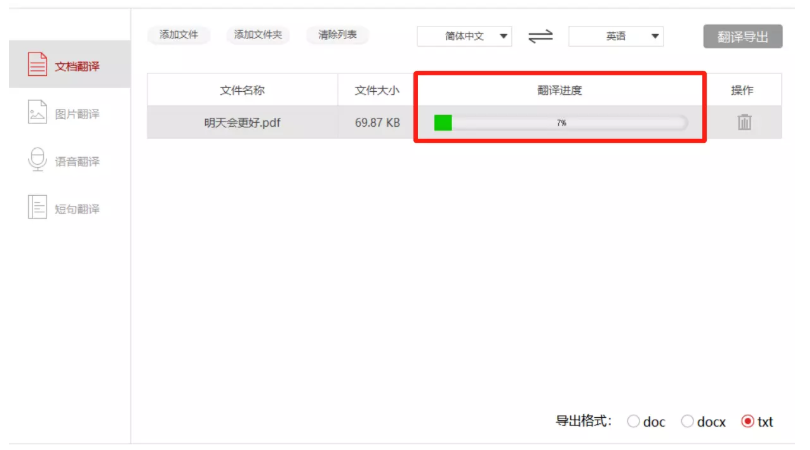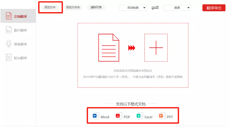 小编就以文档翻译功能为例进行介绍,点击【文档翻译】,然后点击【添加文件】按钮,导入需要处理的文档,或者直接将文档拖拽至指定区域,