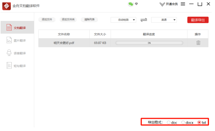 日常办公,想必很多人遇到过关于文章翻译、语音翻译的情况,为了快速完成工作,小编建议大家在电脑中安装金舟文档翻译软件。金舟文档翻译软件是一款小体积的多功能翻译软件,支持翻译文档、图片、短句、语音,充分满足用户需求。
