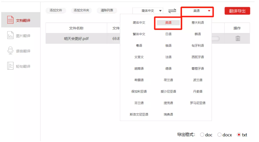 如图,在右上方设置文档翻译语言,设置完成,点击【翻译导出】,
