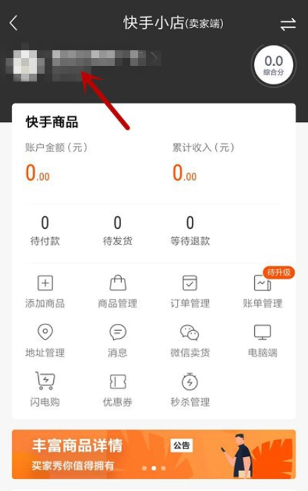 4、进入快手小店,如图,点击自己的账号名称,