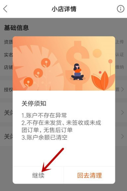 7、关闭店铺需要满足三个条件,确认符合要求,点击【继续】,即可注销快手小店。