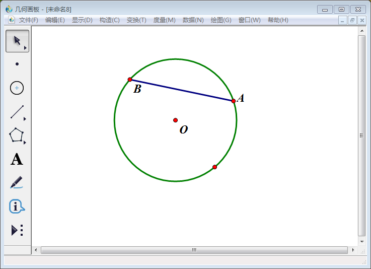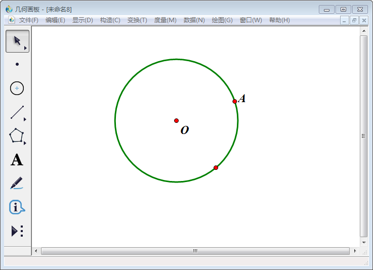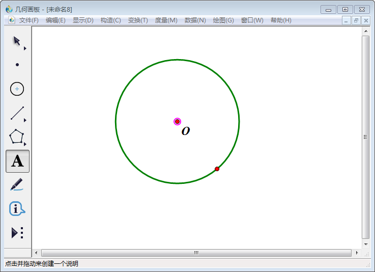 1、打开几何画板,点击左侧工具栏中【圆工具】,任意画一个圆;点击择左侧工具栏中【文本工具】将圆心标为O(以下标注字母均用这个命令,不再一一点明)。