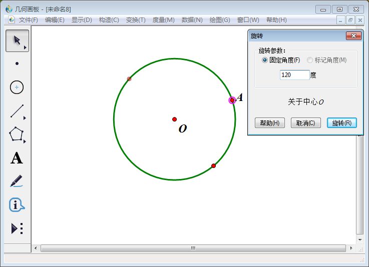5、画板上就得到了点A以点O为中心的旋转120°(旋转参数文本框内度数)之后在圆的点,标为点B。然后使用【线段直尺工具】将连接AB。