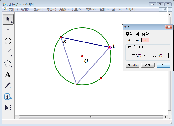 7、弹出迭代窗口,点击画板上B点,窗口中原象A对应初像就变成B,最后点击【迭代】。