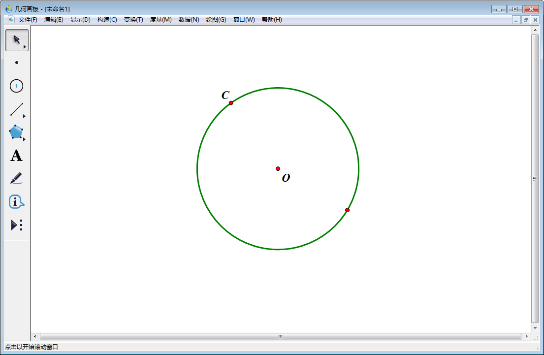 1、打开几何画板,选择左侧工具栏【圆工具】画任意一个圆,使用【文本工具】标记其圆心点为O;然后使用【点工具】在圆上任取一点,并将该点标为C。