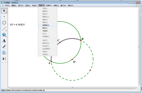 4、使用【移动箭头工具】选中C点和计量OC(即OC=4.34),然后点击上方菜单栏中的【构造】,在其下拉菜单中选择【以圆心和半径绘圆】。