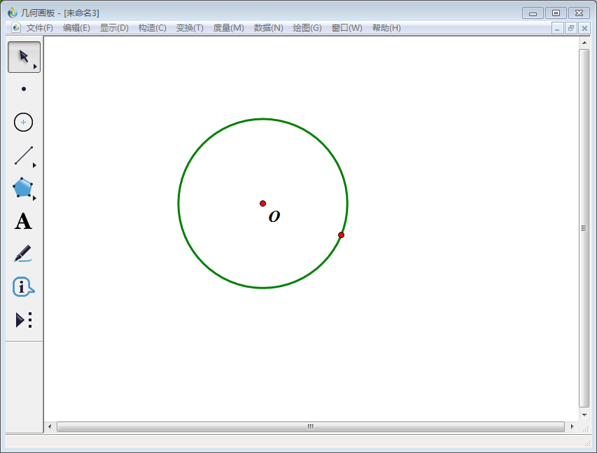 1、打开几何画板,点击左侧工具栏中【圆工具】,在空白画板上任意画一个圆,使用左侧工具栏中【文本工具】将圆心标记为O点。
