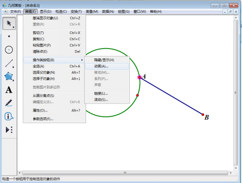 3、使用左侧工具栏中选中【移动箭头工具】选中点A,然后点击上方工具栏中的【编辑】,在其下拉菜单中依次选择【操作类按钮】—【动画】。