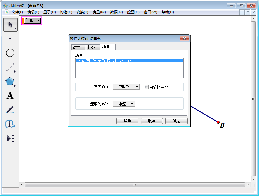 6、如果想改变点在圆上的运动情况和按钮标签,可以右击画板上的【动画点】,在出现的菜单中点击【属性】,就会弹出按钮设置界面。