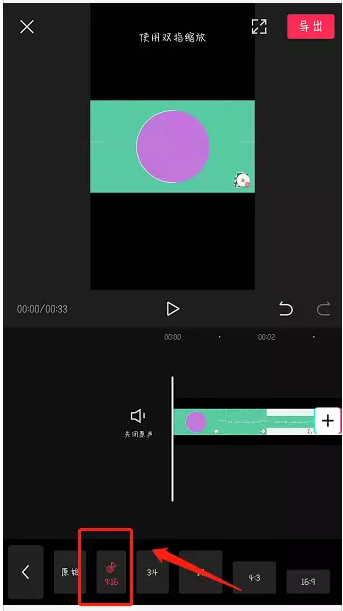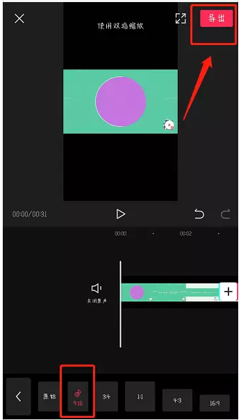 导入视频,进入视频编辑窗口,在下方菜单栏中点击【比例】功能,选择【9:16】,然后点击【导出】,保存视频。