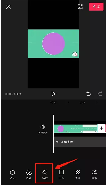 进入视频编辑窗口,在下方菜单栏中点击【比例】,选择【9:16】,然后给视频添加特效,
