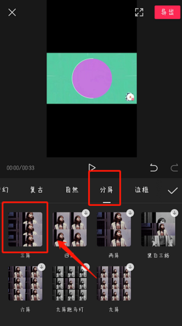 点击【特效】,滑动找到【分屏】,如图,根据实际情况进行选择,小编就以最经典的三屏为例,
