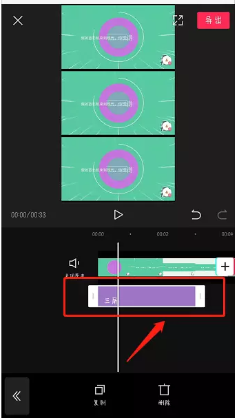 需要注意的是,紫色区域代表了该特效的时长,如果你要让三屏特效贯穿全部视频,一定要把紫色部分拉到最后,