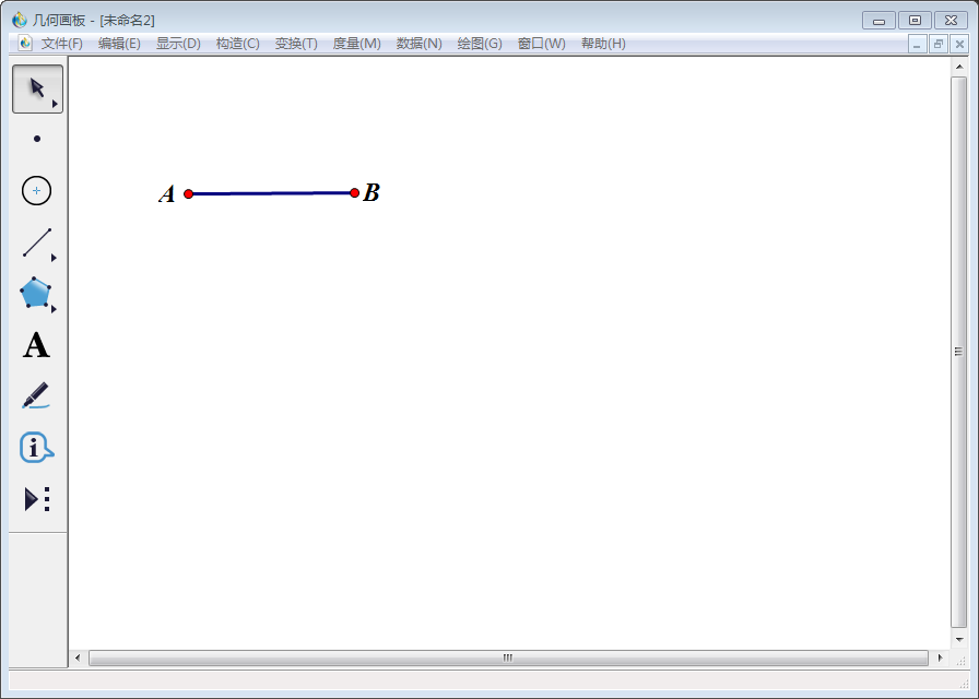 1、打开几何画板,点击左侧工具栏中的【线段直尺工具】在空白画板上画任意一条线段,点击左侧工具栏中的【文本工具】将线段的两个端点分别标为A、B。