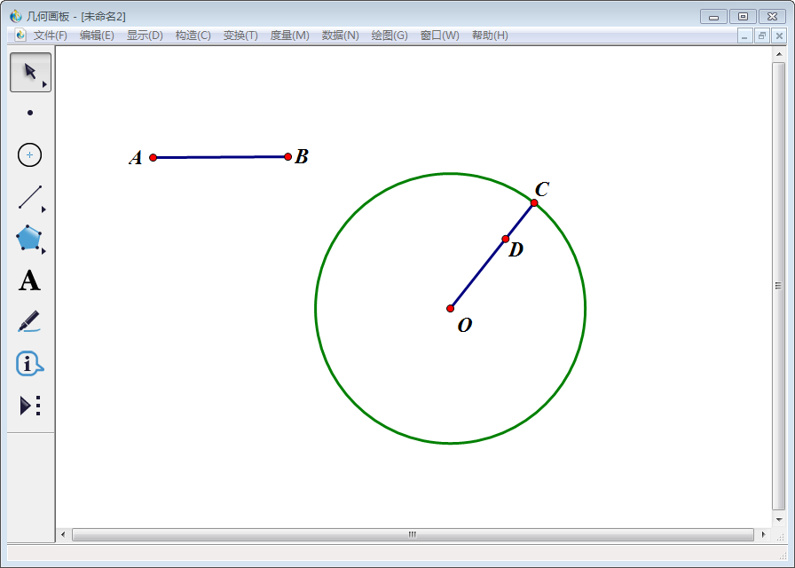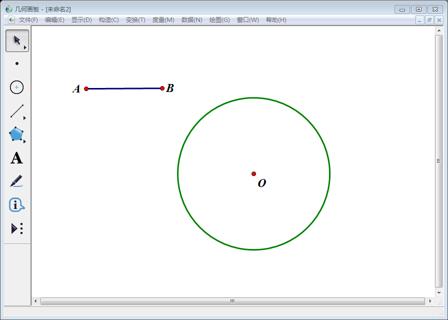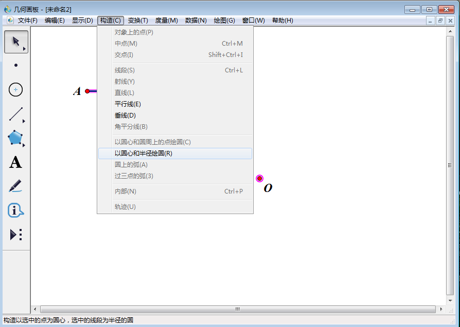 3、点击左侧工具栏中【移动箭头工具】选中点O、线段AB,然后点击上方菜单栏中的【构造】,在其下拉菜单中点击【以圆心和半径绘圆】。