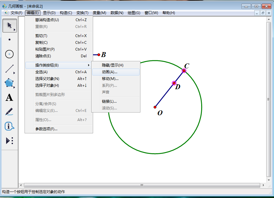 6、使用【移动箭头工具】选中点C、D,点击上方菜单栏中的【编辑】,在其下拉菜单中点击【操作类按钮】—【动画】。