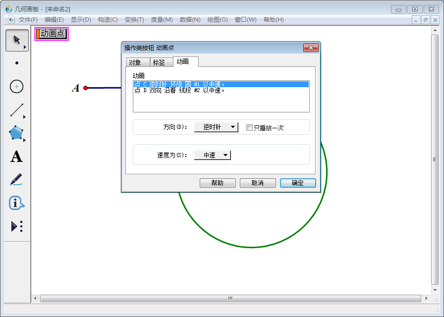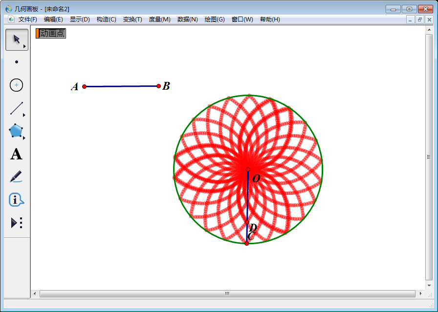 9、点击画板上的【动画点】按钮,就会看到D点被追踪,其运动轨迹形成花瓣展开的图案。