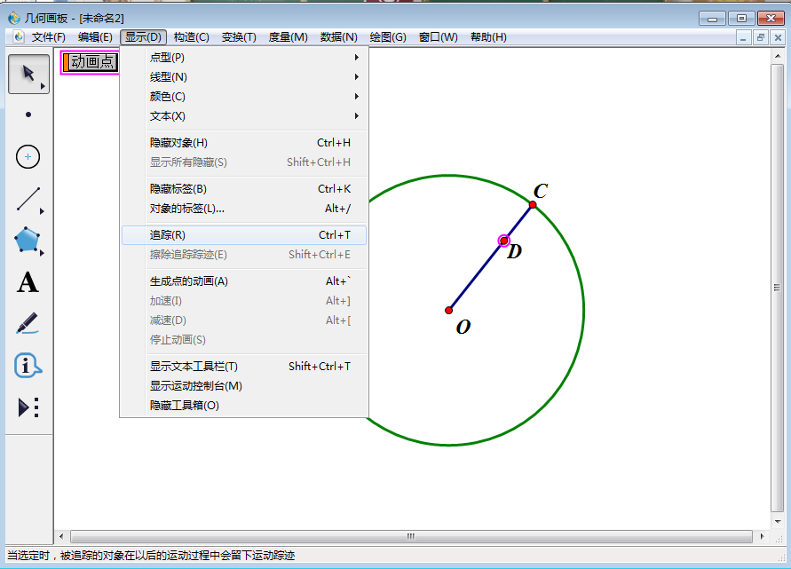 8、使用【移动箭头工具】选中点D,点击上方菜单栏中的【显示】,在其下拉菜单中点击【追踪】。