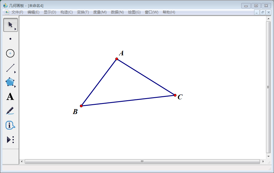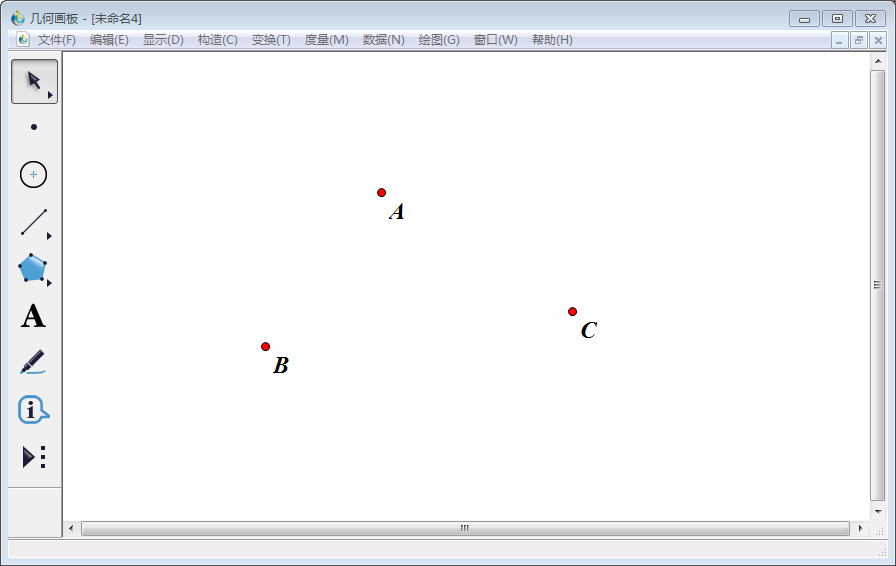 1、打开几何画板,点击左侧工具栏中的【点工具】,按下【Shift】键不放,画出三个不在同一直线上点,使用左侧工具栏中的【文本工具】将其分别标为A、B、C。