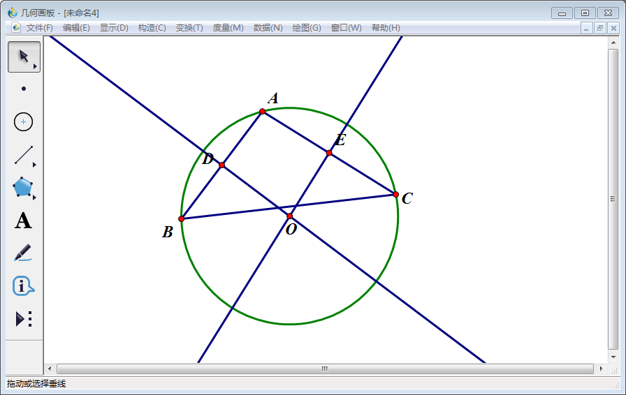 7、同上步操作得到线段AC的中垂线。使用【点工具】画两条垂线的交点,使用【文本工具】将该交点标为O。
