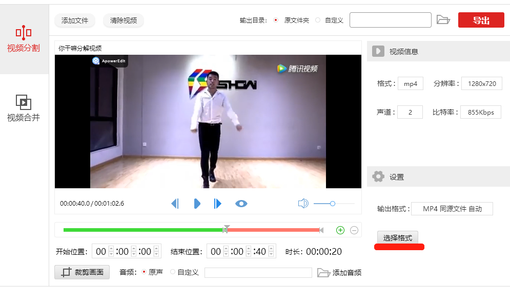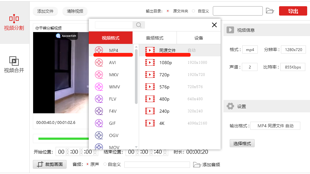 设置完成,点击右下角的【选择格式】,弹出窗口,将视频文件导出保存为MP4格式,点击【同源文件】,