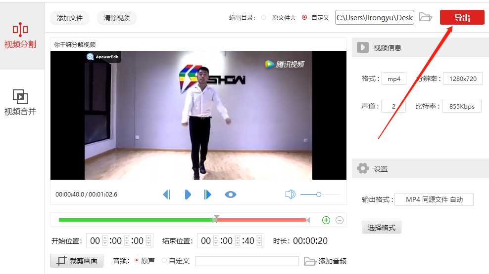 现在点击【输出目录】,选择【自定义】,打开文件夹,设置视频文件输出保存路径,最后点击【导出】即可。