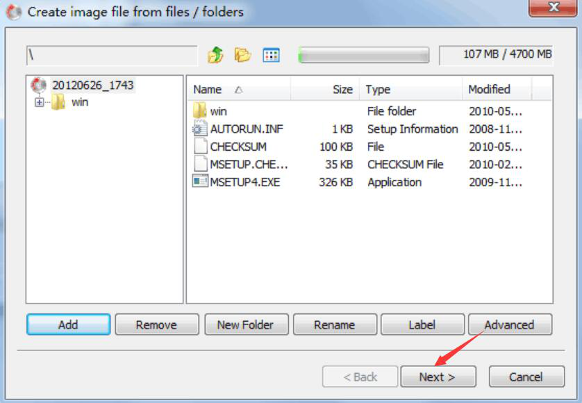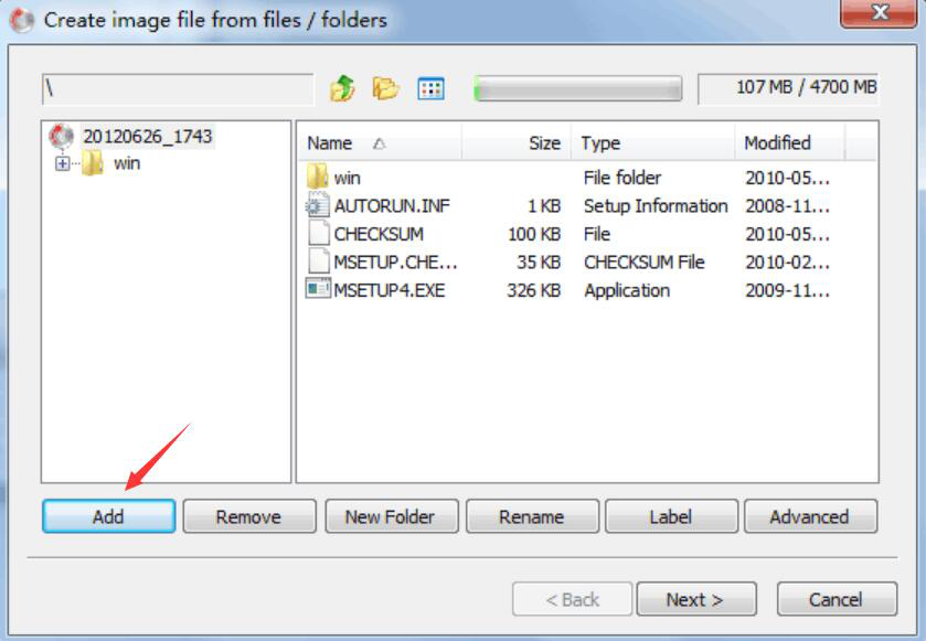2、然后,进入AnyBurn制作光盘镜像的操作界面。用户点击“Add”按钮导入需要制作光盘镜像的文件或文件夹。如果导入的文件有误,那就点击“Remove”按钮即可将它从工程列表中删除。