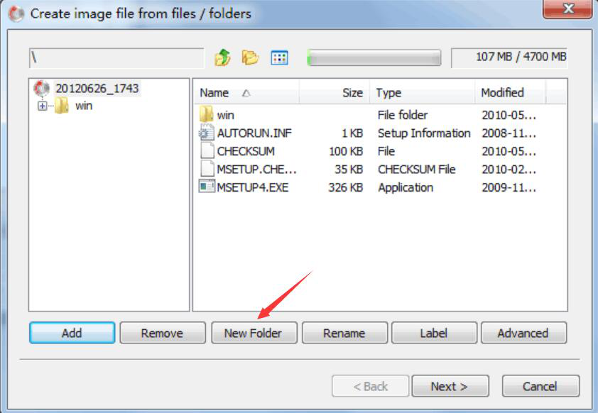3、此外,用户在利用AnyBurn制作光盘镜像时,还可以点击“New Folder”按钮在工程列表中新建一个文件夹。而如果需要对文件夹重命名的话,就可以点击“Rename”按钮重新输入文件夹名称。