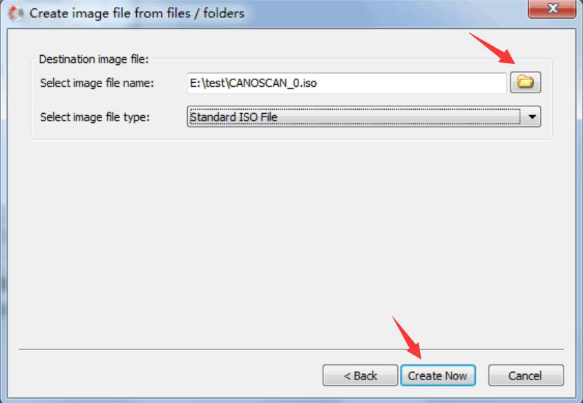 5、接下来,AnyBurn便会弹出从硬盘文件制作光盘镜像文件的窗口,用户需要输入光盘镜像ISO文件的名称,选择光盘镜像文件的类型,再点击“Create Now”的按钮。