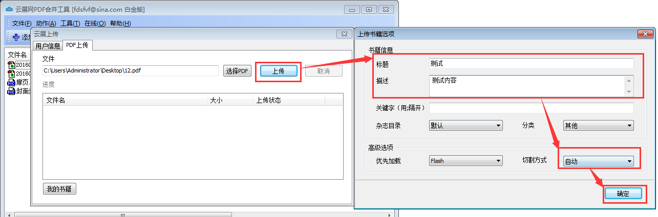 3)点击【上传】,弹出“上传书籍选项”窗口,在窗口中输入标题,描述等内容,其他一般默认,最后点击【确定】。