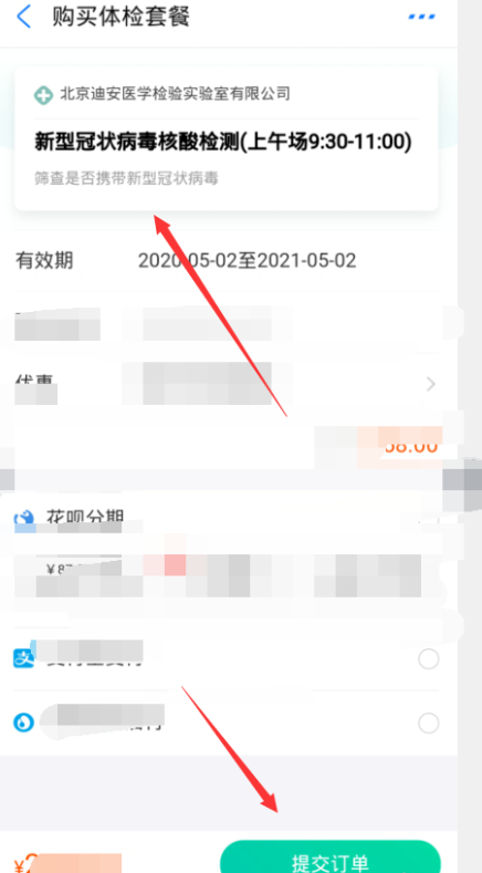 选择个人所在地区,然后选择指定医院,点击查看套餐情况,预约时间,最后点击【提交订单】,支付成功,记得在规定时间去做核酸检测。