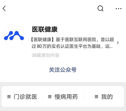 打开手机微信,进入界面,在搜索框中输入【医联健康】,得出查询结果,如图,点击相关公众号,