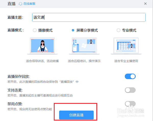 进入以下界面,填写直播主题,勾选相关选项,点击【创建直播】,