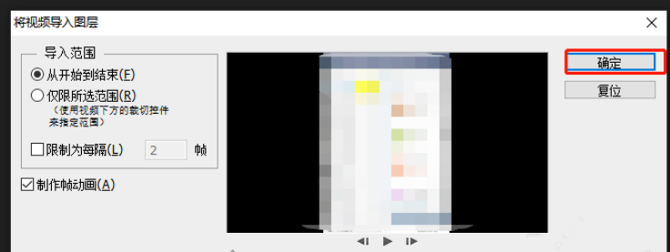 如图,进入【将视频导入图层】窗口,选择导入范围,点击【从开始到结束】,然后点击确定,