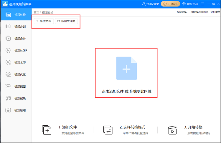 进入以下界面,点击【添加文件】,导入视频文件,或者直接将文件拖拽到指定区域;如果你需要批量转换视频格式,点击【添加文件夹】,
