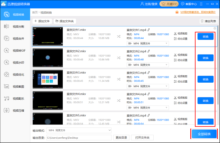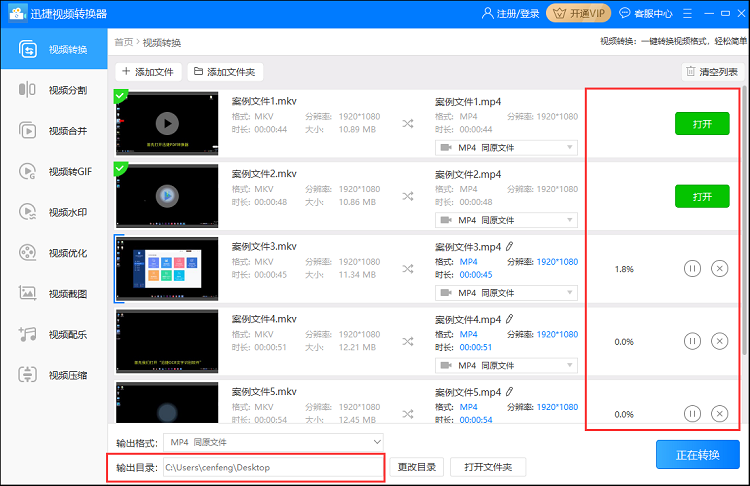 设置完成,点击【转换】或者【全部转换】,迅捷视频转换器就会将MKV视频转换成MP4格式,耐心等待,