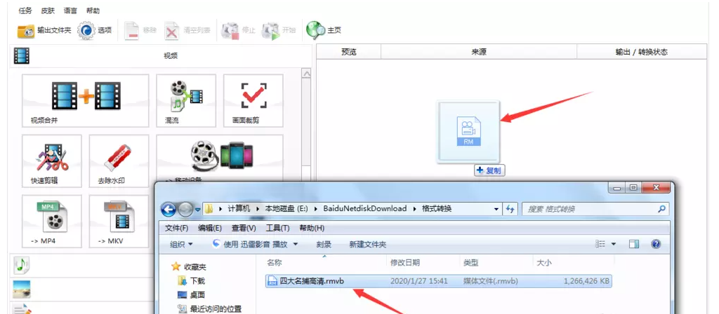 打开格式工厂,进入软件界面,这里是将RMVB视频文件转换成MP4格式,使用鼠标点击文件并将其拖拽到指定区域,然后松开鼠标,